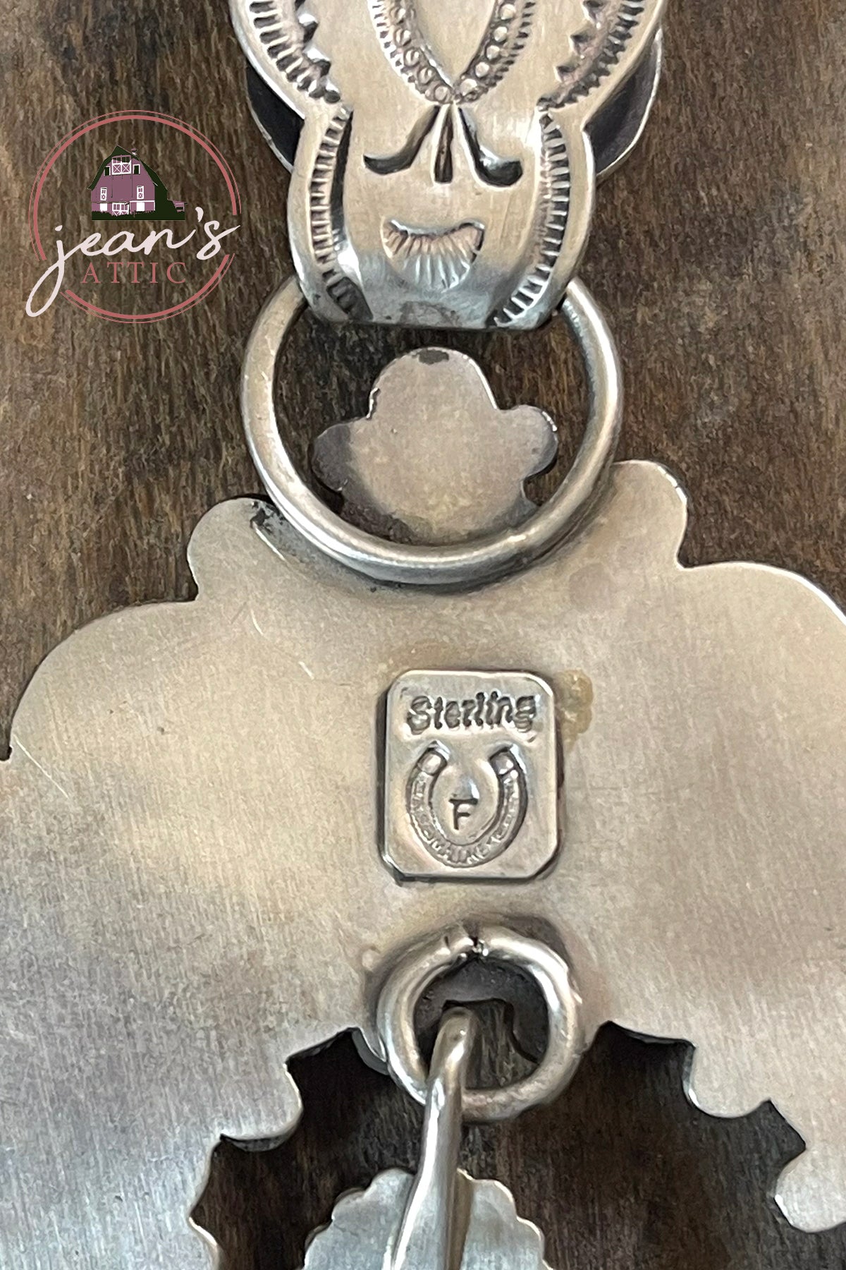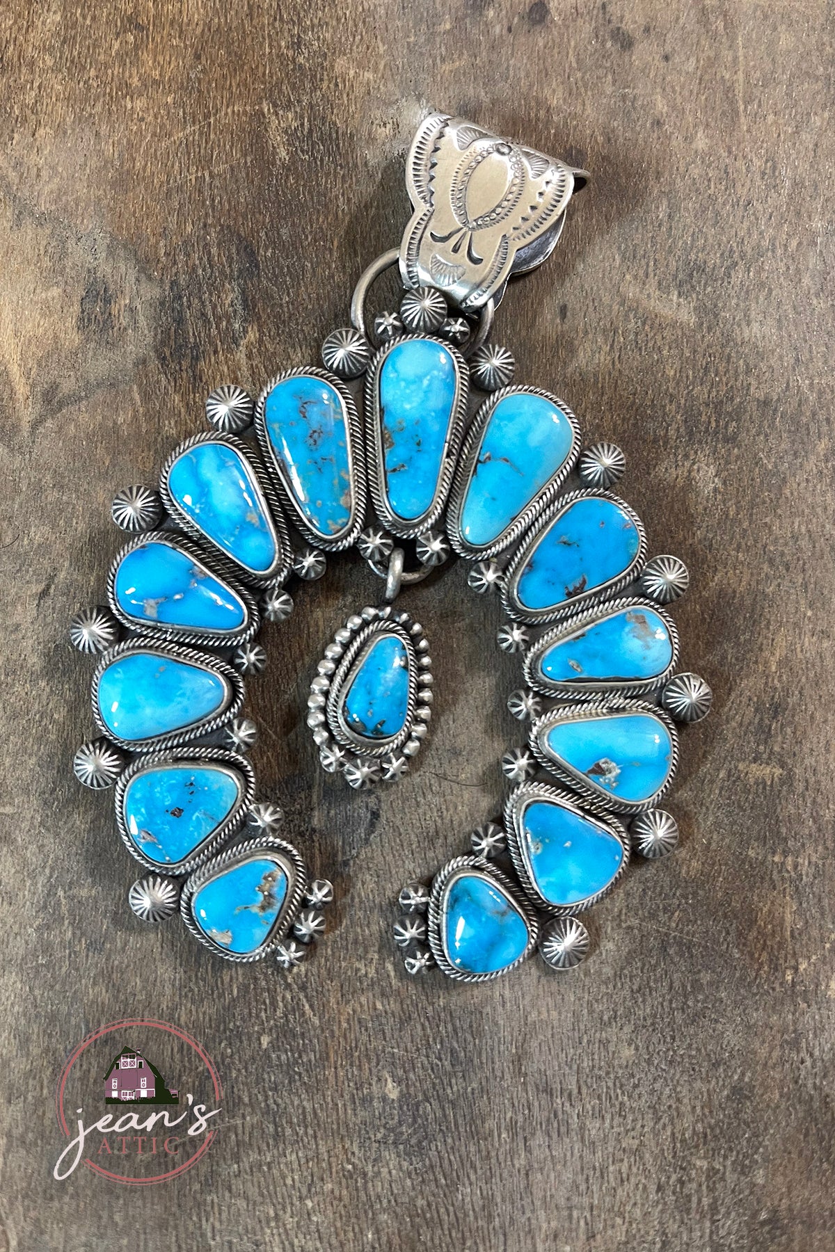 Kingman Turquoise Naja Pendant stamped sterling and stamped by Navajo Artist Fred Maloney. Measures 4" long by 3" wide