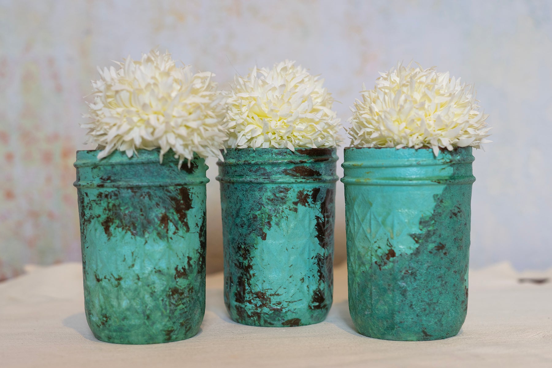 Small Patina Mason Jars for home decor. These do not come with the greenery / flowers, jars only, set of 3