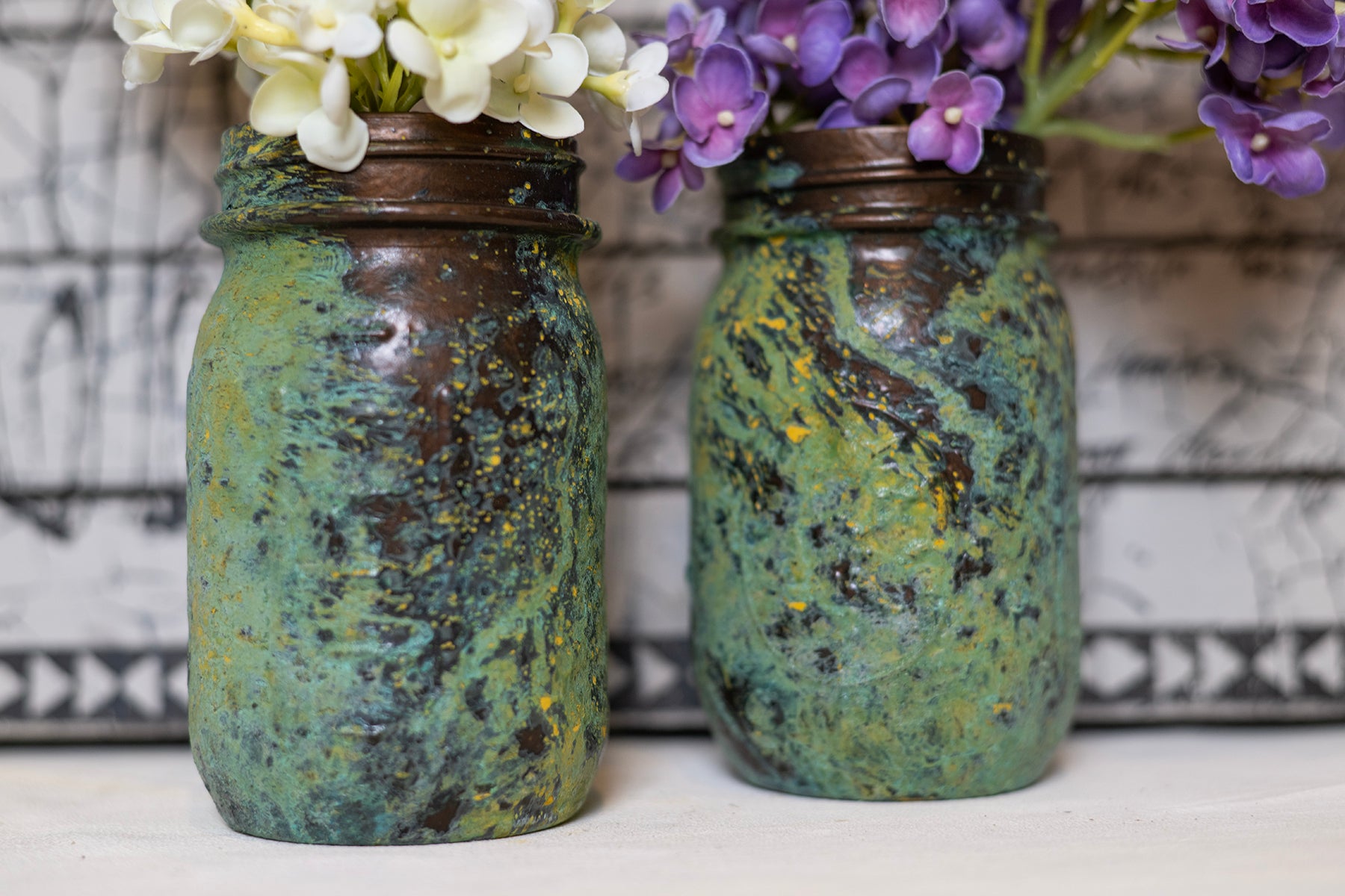 Patina Mason Jars - Set of 2. Medium sized. These do not come with the flowers.