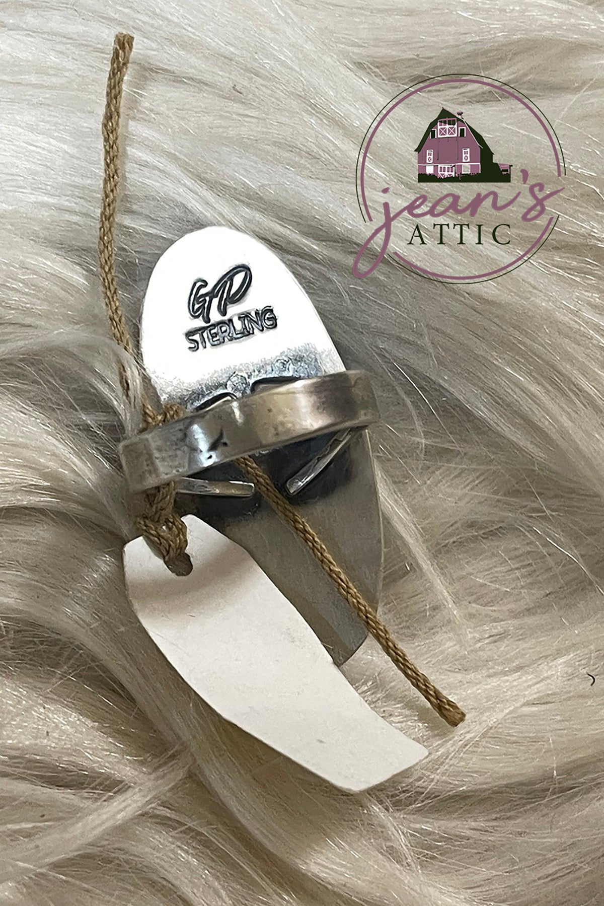 Turquoise Ring by Navajo Artist Gilbert Platero. Size 8. Measures 1.75″. Stamped by Artist.